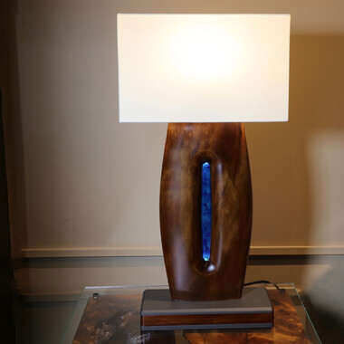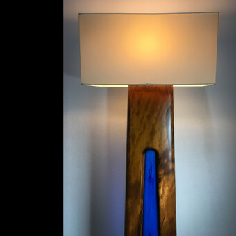 Ancient Kauri coupled with ocean blue transparent resin. Cnc machined from solid stock. Hand assembled and finished. Base height 1.5 metres plus shade is 1.8 total height