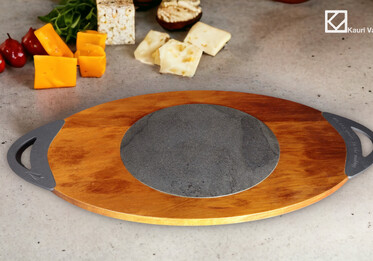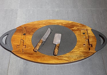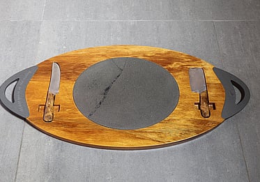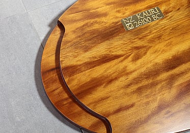 Oval Solid Ancient Kauri cheese and charcuterie board with NZ South Island Bluestone inlayed in the Kauri. The Bluestone adds a surface for cutting while protecting the Kauri.