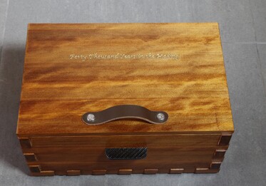 Ancient Kauri Humidor constructed with solid Kauri and fully lined with 9mm solid unfinished Sapele. Solid brass Quadrant hinges and clasp with a lined lid to insure the right environment for housing only the best cigars. Spanish Cedar shelf for double layer storage. This box was carved with client specified image and engraving. This service is available on most all of our products by request.