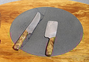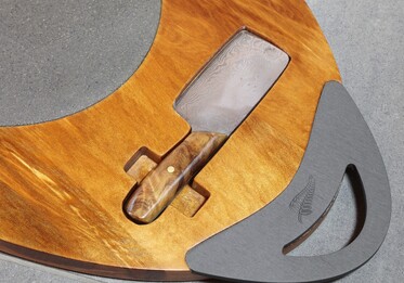 Handmade Damascus steel cheese cleaver and soft cheese knife with ancient Kauri handles.