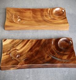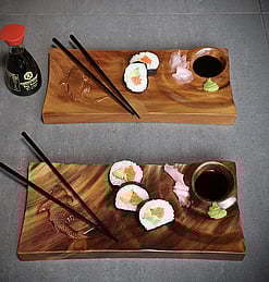 Ancient Kauri Sushi plates carved to hold your Sashimi and Sushi in perfect harmony with wasabi and soy.