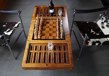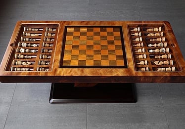This chess table is a single slab of ancient Kauri carved to hold and display the beautifully hand turned Chess pieces. The table is solid Ancient Kauri with Puriri (native NZ timber) inlayed into the Ancient Kauri slab with a Wenge frame. The base is a modern pedestal style made of ancient Kauri with a solid Wenge base. The Chessmen are all hand turned from Kauri and Puriri and sport turned deer antler for their capes and bases. The pieces are so beautiful, they deserve to be displayed and are housed beneath low iron crystal clear toughened glass when not in use. The Glass tops are flush with the chess table and serve as a flat surface.