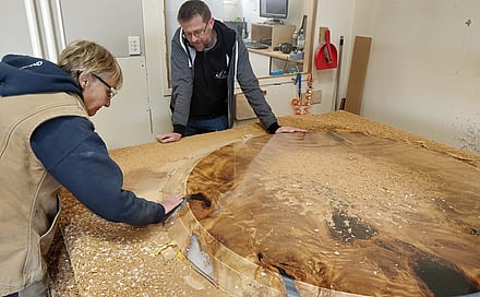 Work is done to secure the integrity of the slab remains consistent with no cracking or moving, with intensive finishing processes to highlight the best of the wood.