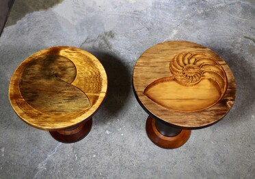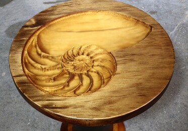 Round Kauri end tables carved depicting the prehistoric Nautilus shell. One table is the inside of the shell, the other table is the outside of the shell. A perfect pairing with the age of NZ Kauri being as old as the nautilus.