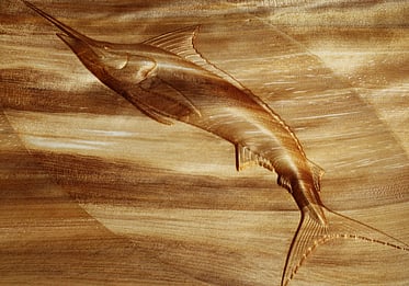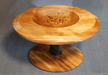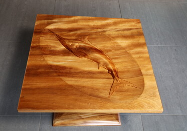 Kauri carved with marlin 3D inlayed in table . Perfect sport Fishermans cocktail table to laugh over the days catches (or the ones that got away).