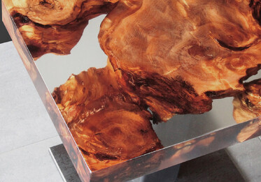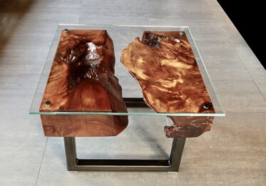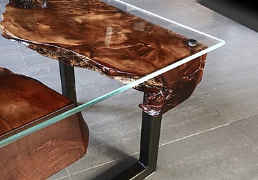 Book-end pieces of chunky swamp Kauri free floating beneath low iron crystal clear glass.