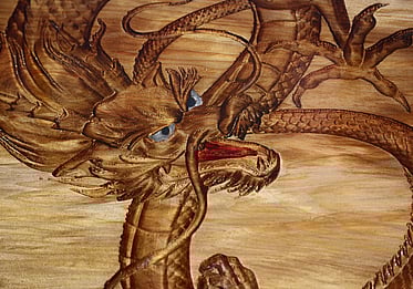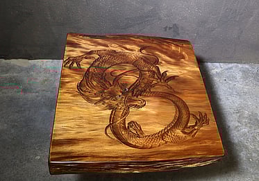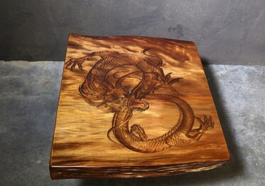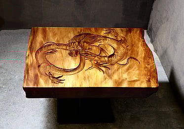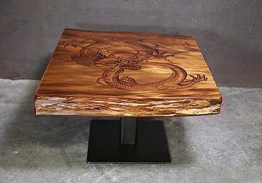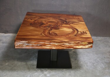 Beautiful Ancient Kauri cocktail table with two natural edges. A Five finger dragon has been detail carved and filled with clear resin. Created as a "Hollow mask illusion". As you move around the table it appears like the dragon's eyes are following you