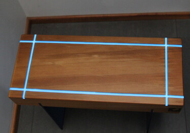 The two tables displayed here, one with carbon fibre legs, the other using electric blue anodised aluminium legs with matching light blue phosphorescent resin that glows in the dark and recharges with light during the day.